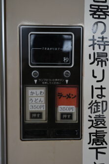 本題の自販機メニューですが、ここは「かしわうどん」「ラーメン」の2種類があります。特にかしわうどんはおそらくここだけでしか食べる事ができないメニューになっています。値段はどちらも350円で、良心的な価格となっています。